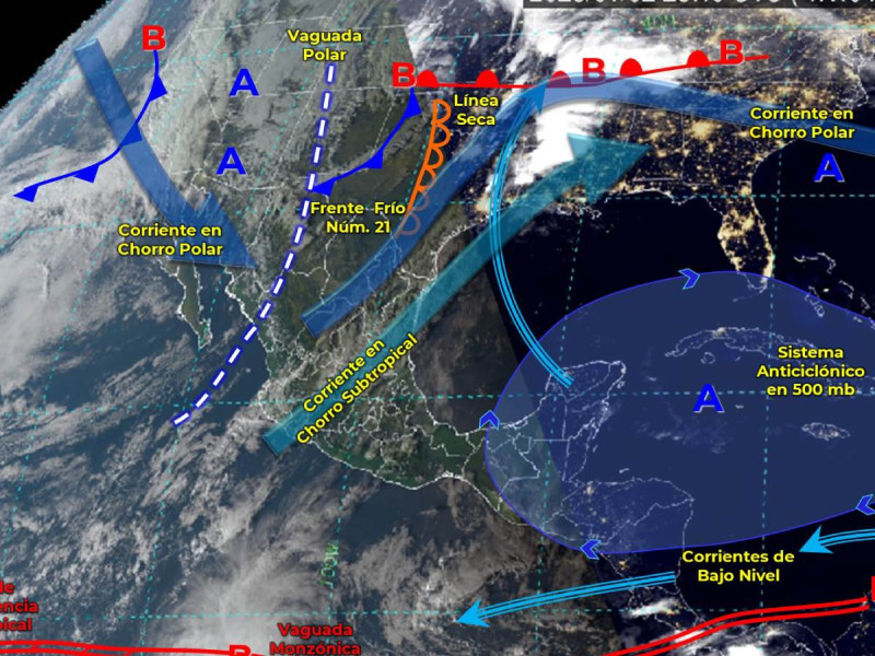 El frente frío número 21 se posicionará sobre el noreste de la República Mexicana, mientras que la corriente en chorro polar afectará al noroeste y norte del territorio nacional, ambos sistemas ocasionarán ambiente matutino frío a muy frío, vientos fuertes y tolvaneras.