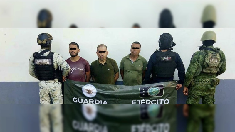 Policías estatales y soldados del Ejército y Guardia Nacional, lograron el aseguramiento de tres hombres en posesión de armas largas, armas cortas y equipo táctico, en el municipio de Parácuaro.