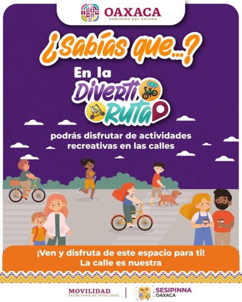 Este domingo 20 de agosto niñas, niños, adolescentes y público en general podrán disfrutar de más de 40 actividades lúdicas, recreativas y deportivas que forman parte de la DivertiRuta, una iniciativa del Gobierno de Oaxaca que busca la apropiación de los espacios públicos para la diversión y sana convivencia.
