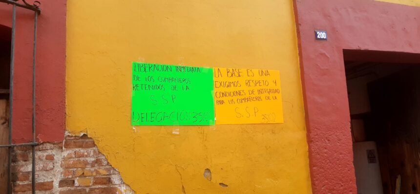 Este día trabajadores Sindicalizados de la Secretaría de Seguridad Pública, se manifiestan en apoyo a sus compañeros retenidos en el cuartel general y de su secretario de seguridad pública, para que sean liberados.