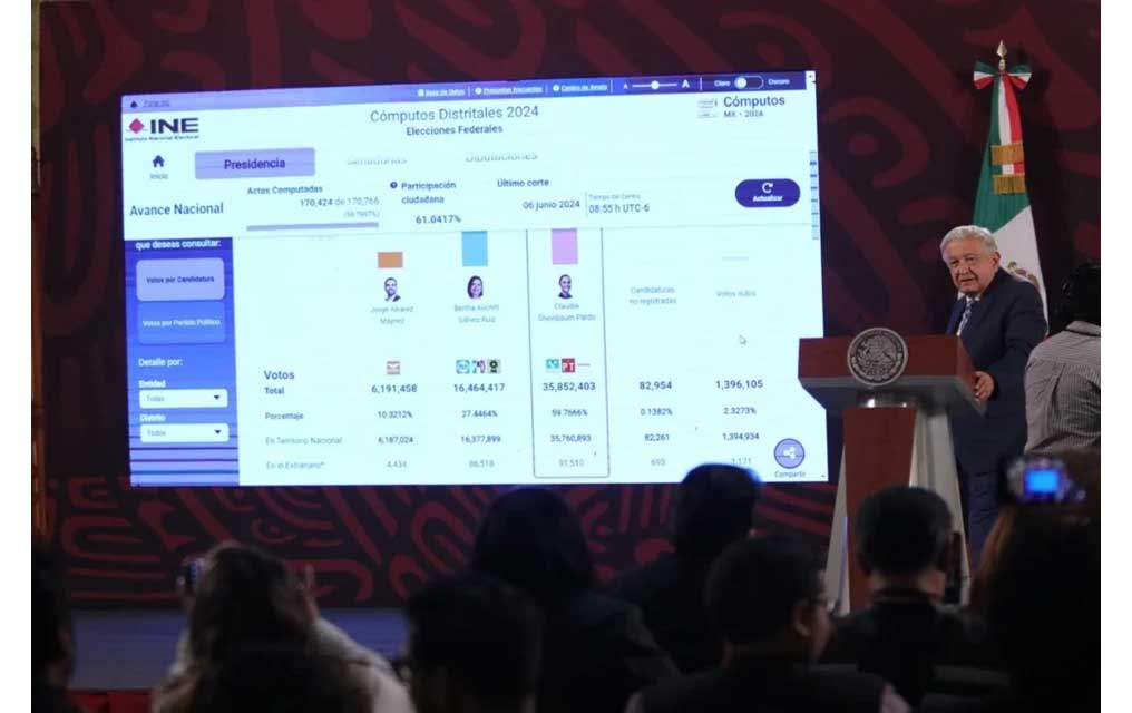 Esta mañana, en conferencia en Palacio Nacional, el Mandatario federal expuso el dato de los cómputos distritales, donde con 99.7921% de casillas computadas Claudia Sheinbaum alcanza la victoria con 35 millones 859 mil 395 votos. Mientras que en 2018 el Presidente López Obrador obtuvo solamente 30 millones 113 mil 482.